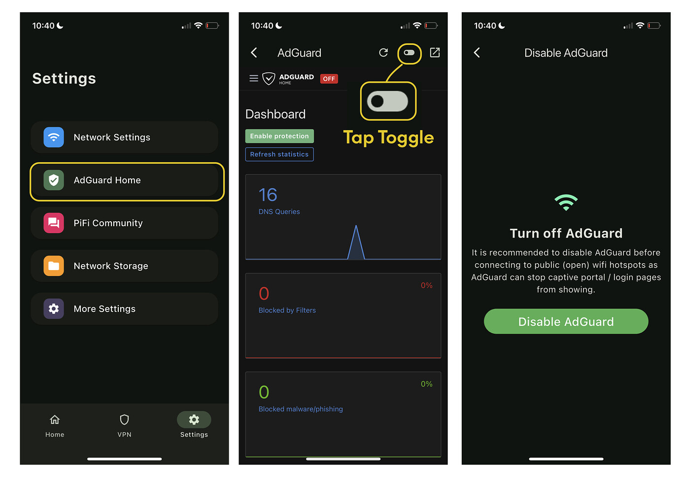 Visit PiFi App > Settings > AdGuard Home .