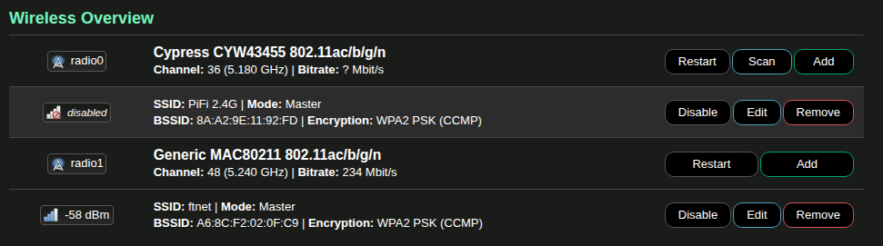 However, if I open my browser to the Luci interface, I can see a new AP named “PiFi 2.4G”. I set a password for it, saved the changes and rebooted the pi. However, it now says it is disabled, although I can’t see an “enable” button for it… See attached screenshot.