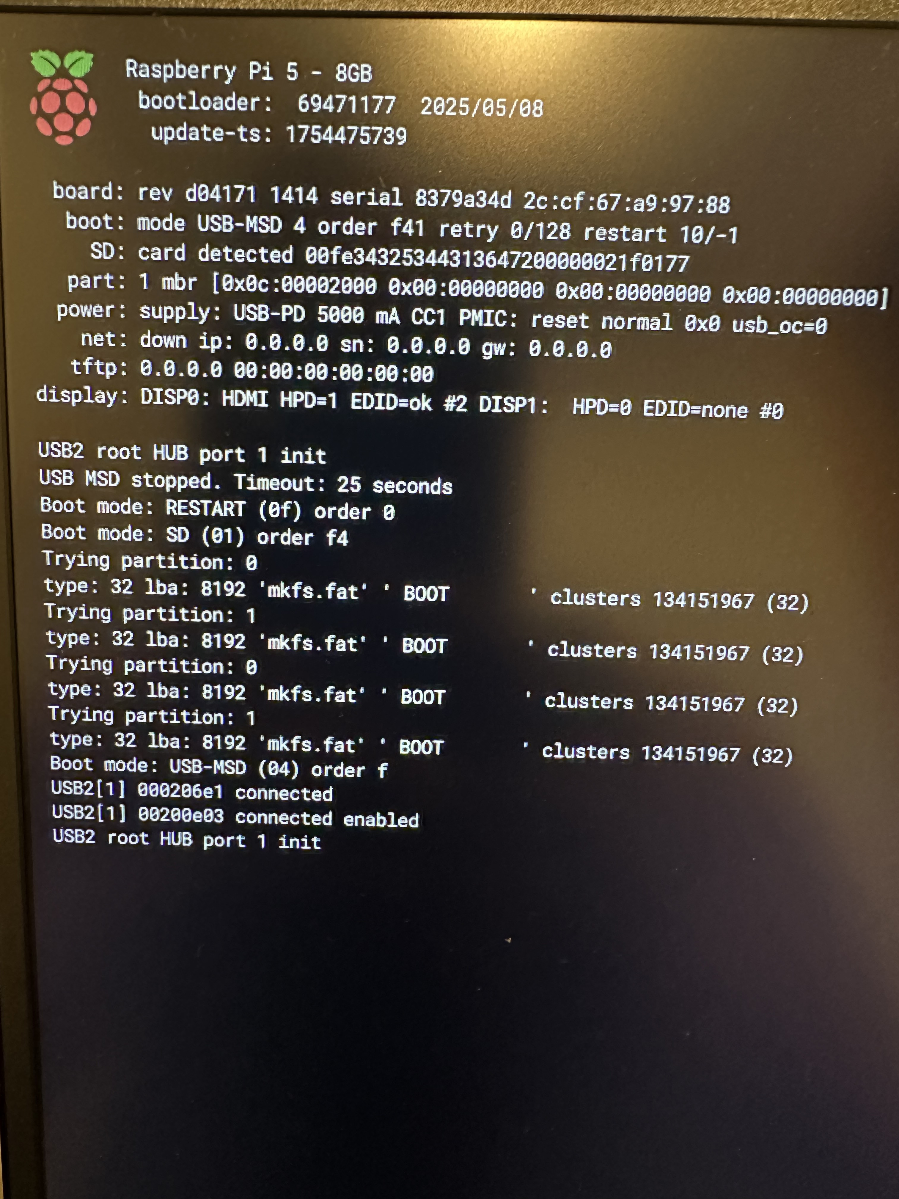 Changed back to SD Boot now getting green blinking flashing light and solid green screen. Not finding PiFi in my WiFi settings either. Using iPhone iOS 18.6. Also trying to connect via WiFi instead of router because currently in the move process and no longer have a router.