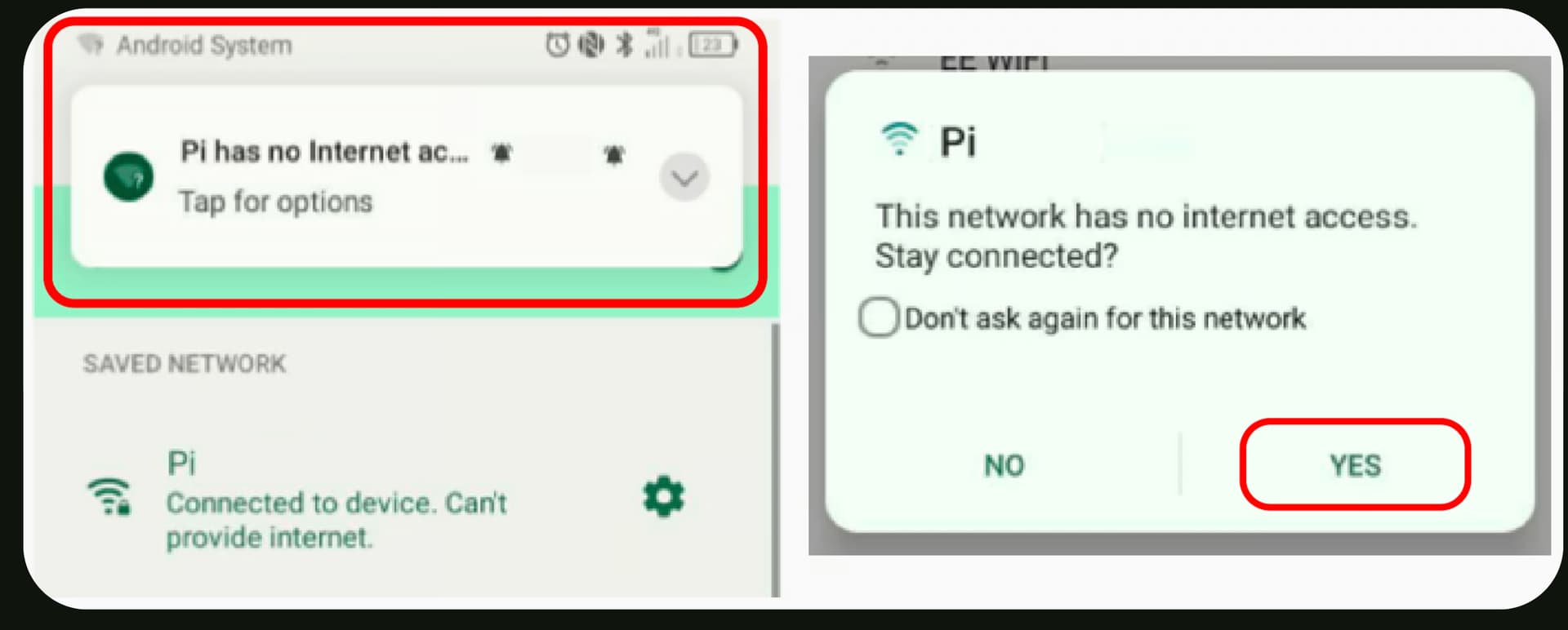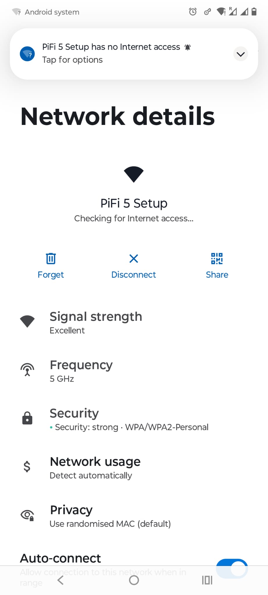 Result → No upstream Internet → Android warns “No Internet access”